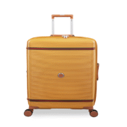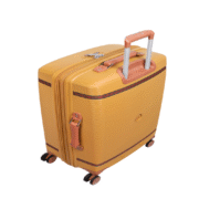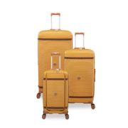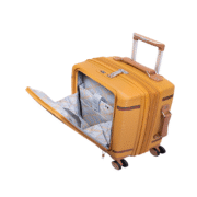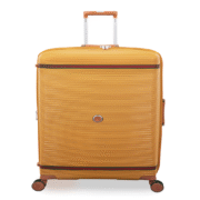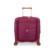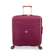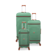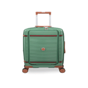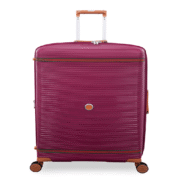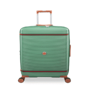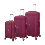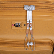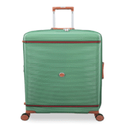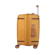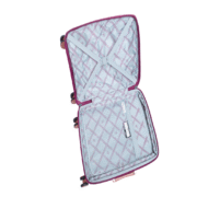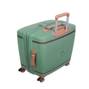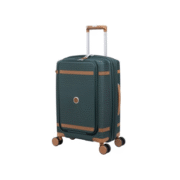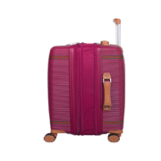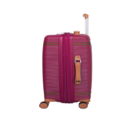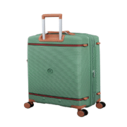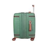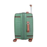 Hard outer shell made from tough Polypropylene (PP) material. Stylish ribbed effect design detailed with green & red decoration webbing, alongside the almond trims and accents. Clamshell design central opening for organized packing. Telescopic trolley system with additional top grab-handle.